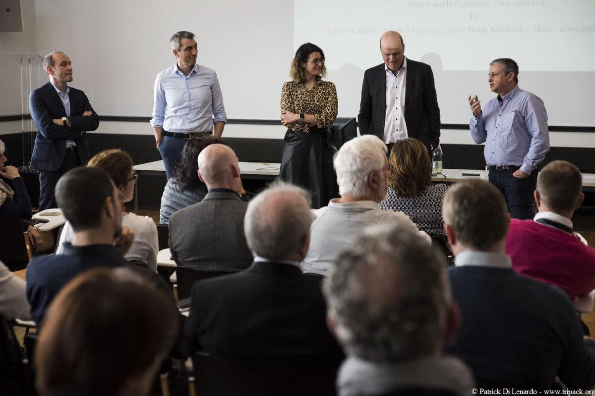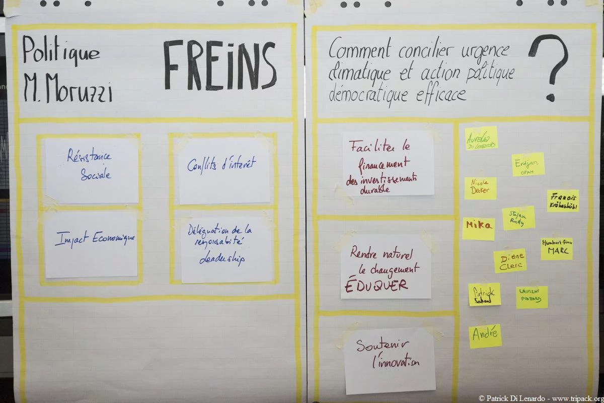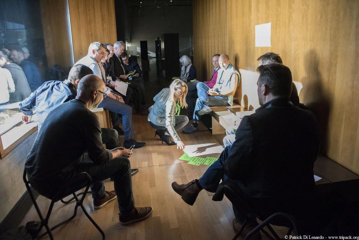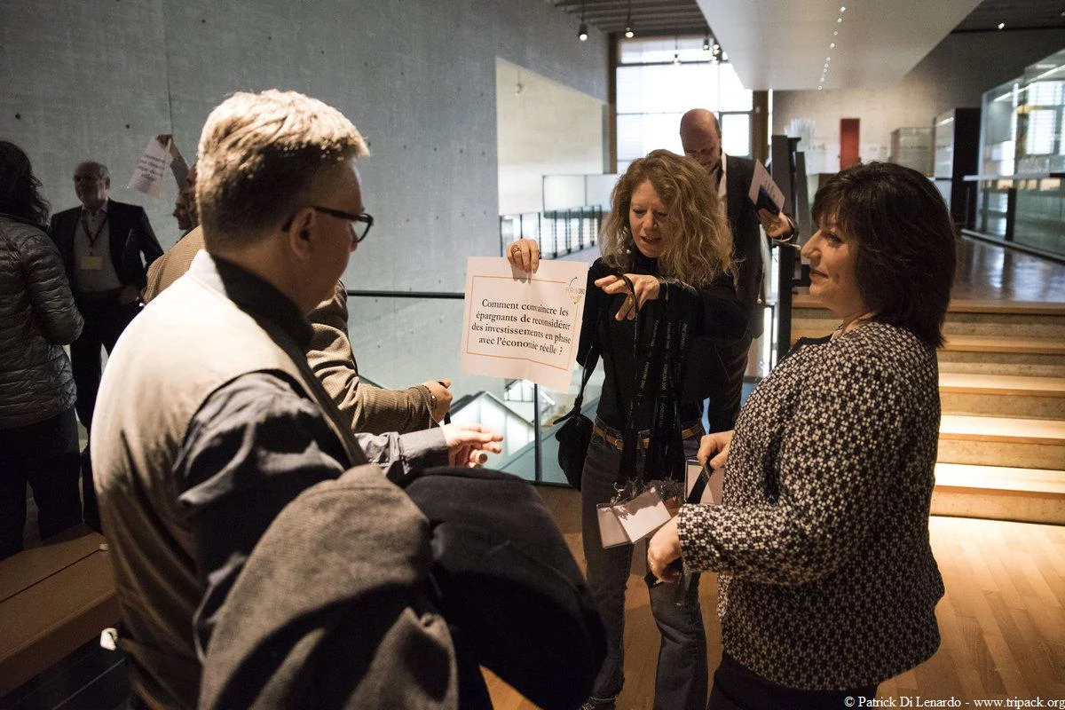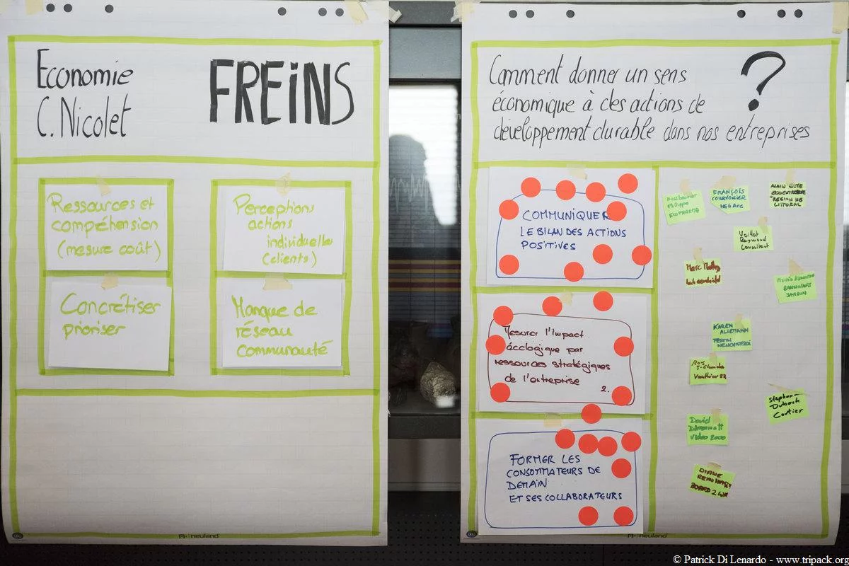 Ces personnalités ont, chacune à leur tour, effectué un pitch de 3min afin d’adresser une question aux chefs d’entreprises et acteurs de l’économie présents dans la salle afin de susciter la réflexion et des actions possibles pour répondre à cette question. Epaulés de facilitatrices de l’association Ecoparc, dont la mission était de stimuler les échanger entre les participants, les quatre groupes de travail ont été invités à proposer des actions concrètes et réalisables.